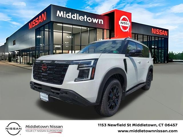 Middletown Nissan is proud to present you with another True Market Priced Vehicle. This 2025 Nissan Armada PRO-4X is loaded with the following Factory Options: 12 Speakers, 3rd row seats: split-bench, 4-Wheel Disc Brakes, ABS brakes, Adaptive suspension, Air Conditioning, Alloy wheels, AM/FM radio: SiriusXM, Anti-whiplash front head restraints, Auto High-beam Headlights, Auto tilt-away steering wheel, Auto-dimming door mirrors, Auto-dimming Rear-View mirror, Auto-leveling suspension, Automatic temperature control, Brake assist, Bumpers: body-color, Delay-off headlights, Driver door bin, Driver vanity mirror, Dual front impact airbags, Dual front side impact airbags, Electronic Stability Control, Emergency communication system: NissanConnect Services, Four wheel independent suspension, Front anti-roll bar, Front Bucket Seats, Front Center Armrest, Front dual zone A/C, Front fog lights, Front reading lights, Fully automatic headlights, Garage door transmitter: myQ Connected Garage, Genuine wood dashboard insert, Heated door mirrors, Heated Front Bucket Seats, Heated front seats, Heated steering wheel, HVAC memory, Illuminated entry, Knee airbag, Leather steering wheel, Low tire pressure warning, Memory seat, Navigation System, Occupant sensing airbag, Outside temperature display, Overhead airbag, Overhead console, Panic alarm, Passenger door bin, Passenger vanity mirror, Power door mirrors, Power driver seat, Power Liftgate, Power passenger seat, Power steering, Power windows, Premium Paint, PRO-4X Carpeted Floor Mats, PRO-4X Mud Guards, PRO-4X Unique Quilted Leather Seat Trim, Radio: NissanConnect w/SiriusXM 360L, Rain sensing wipers, Rear air conditioning, Rear anti-roll bar, Rear Bumper Protector, Rear reading lights, Rear seat center armrest, Rear window defroster, Rear window wiper, Reclining 3rd row seat, Remote keyless entry, Roof Rail Cross Bars, Security system, Speed control, Speed-sensing steering, Speed-Sensitive Wipers, Split folding rear seat, Spoiler, Steering wheel memory, Steering wheel mounted audio controls, Tachometer, Telescoping steering wheel, Tilt steering wheel, Traction control, Trip computer, Turn signal indicator mirrors, Variably intermittent wipers, Voltmeter, and Wheels: 20 Painted PRO-4X Alloy!!